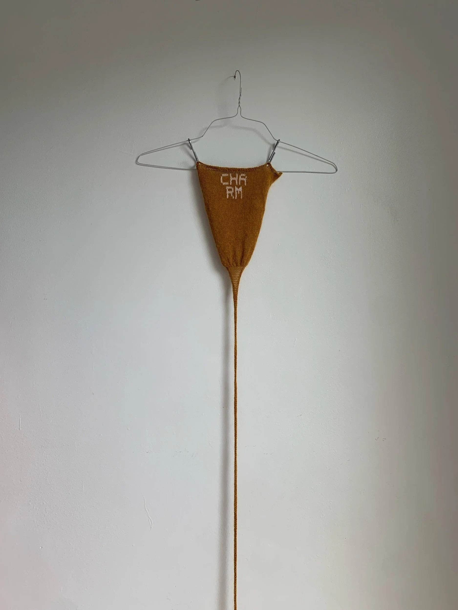 These thongs are a my own invention based loosely on fundoshi, traditional Japanese swimwear. They are knitted using partial knitting to create ‘darts’ as in the heel of a sock, in order to make space for the genitals (so they are ‘menswear,’ loosely). You want to really cinch it: When tied tightly enough onto the body, such that the sides of the pouch sit flush on the flesh, and the round-the-waist forms a T with the up-the-ass, they are somewhat functional as underwear, swimwear, etc. They look chic on the wall too.