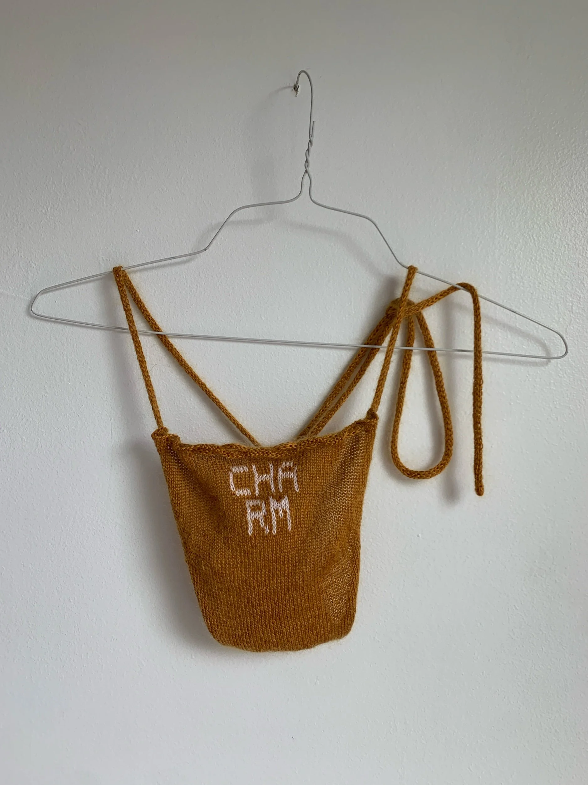 The thongs all have the same general design, but each time I make one I tend to modify things slightly for experiment. Differences in material, knitting gauge, tail thickness, hole size, etc apply. Some give greater coverage than others. I will note certain mutable qualities in each particular listing. I’ve washed them all at once, so they may have some of each other’s fibers clinging.