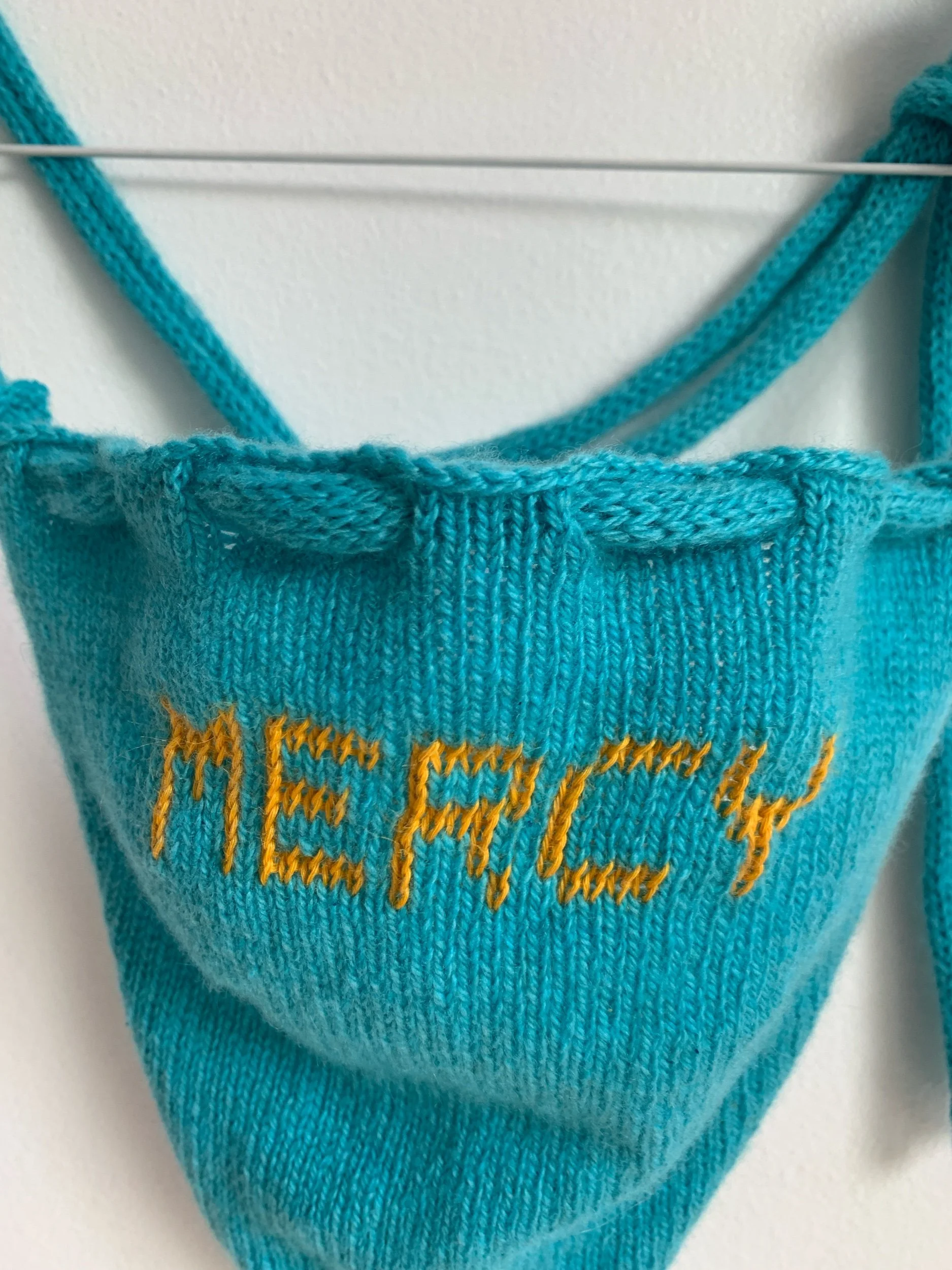 These thongs are a my own invention based loosely on fundoshi, traditional Japanese swimwear. They are knitted using partial knitting to create ‘darts’ as in the heel of a sock, in order to make space for the genitals (so they are ‘menswear,’ loosely). You want to really cinch it: When tied tightly enough onto the body, such that the sides of the pouch sit flush on the flesh, and the round-the-waist forms a T with the up-the-ass, they are somewhat functional as underwear, swimwear, etc. They look chic on the wall too.