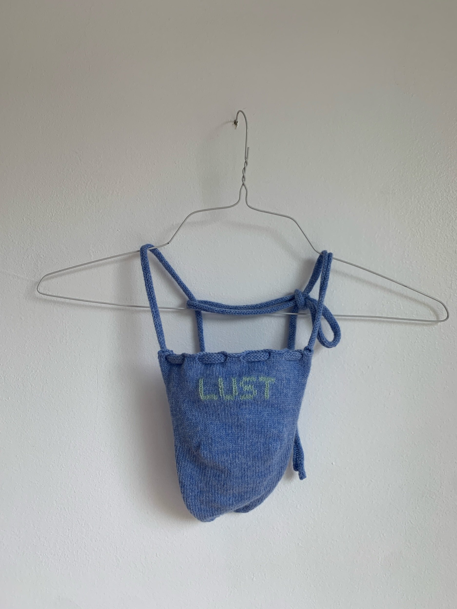These thongs are a my own invention based loosely on fundoshi, traditional Japanese swimwear. They are knitted using partial knitting to create ‘darts’ as in the heel of a sock, in order to make space for the genitals (so they are ‘menswear,’ loosely). You want to really cinch it: When tied tightly enough onto the body, such that the sides of the pouch sit flush on the flesh, and the round-the-waist forms a T with the up-the-ass, they are somewhat functional as underwear, swimwear, etc. They look chic on the wall too.